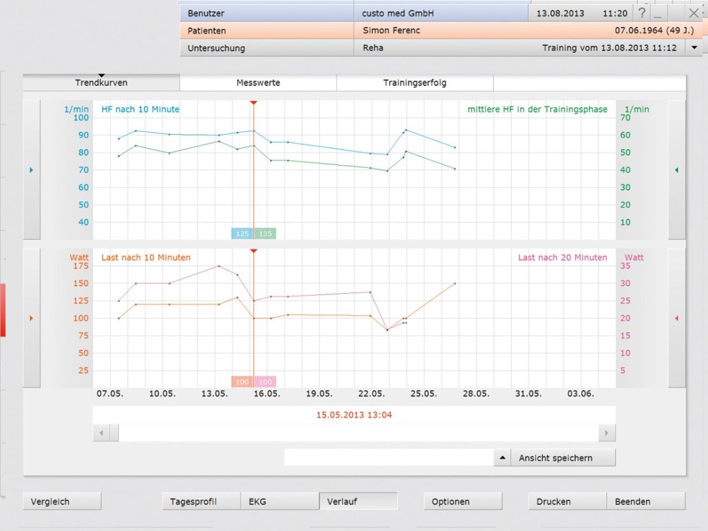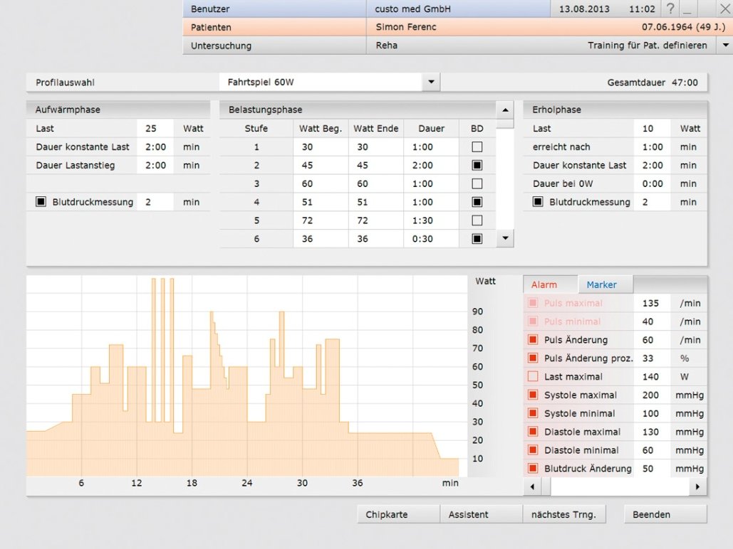 Önceden tanımlanmış bir sonraki antrenman profil seçimi. Mevcut hasta için bireysel adaptasyon. Alarm fonksiyonları için limit değerler ayarlanabilir.