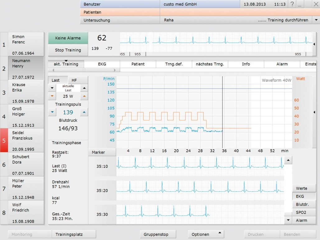 Aynı anda monitör başına 8 hastaya kadar izleme yapılabilir. Üreticiden bağımsız olarak bisiklet ergometre, koşu bandı veya kol ergometre vb. cihazlar serbestçe kombine edilebilir. Antrenman parametreleri serbestçe ayarlanabilir. Yük modifikasyonu her zaman mümkündür.