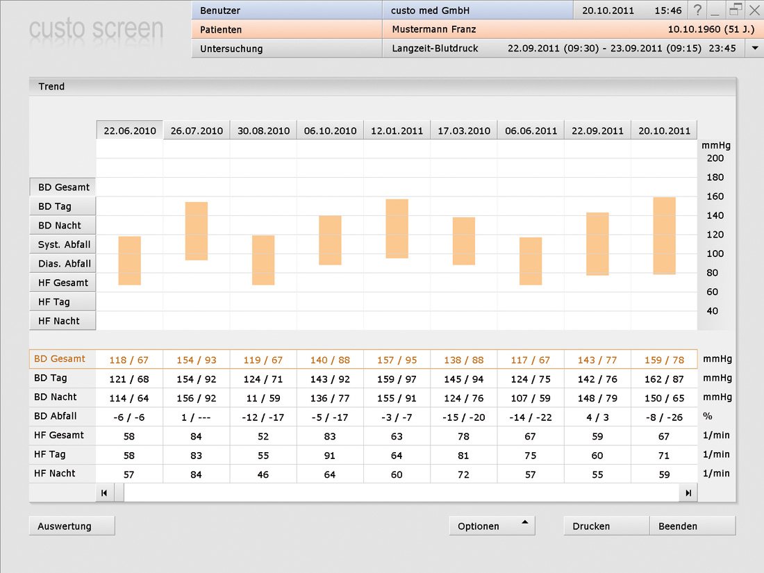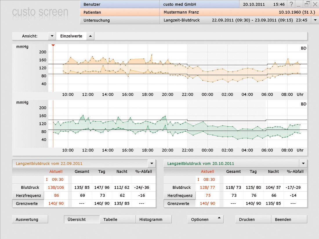 Uzun süreli tedavilerin değerlendirilmesi custo screen programı ile mümkündür. Hastanın tüm kayıtları zamana bağlı olarak sırasında yan yana karşılaştırılır. Herhangi bir zamanda tek bir değerlendirmeye ulaşmak mümkündür.