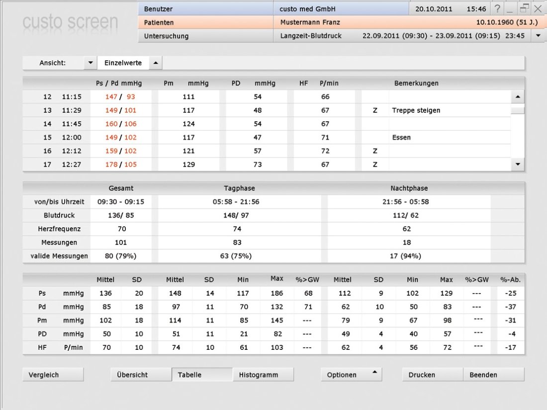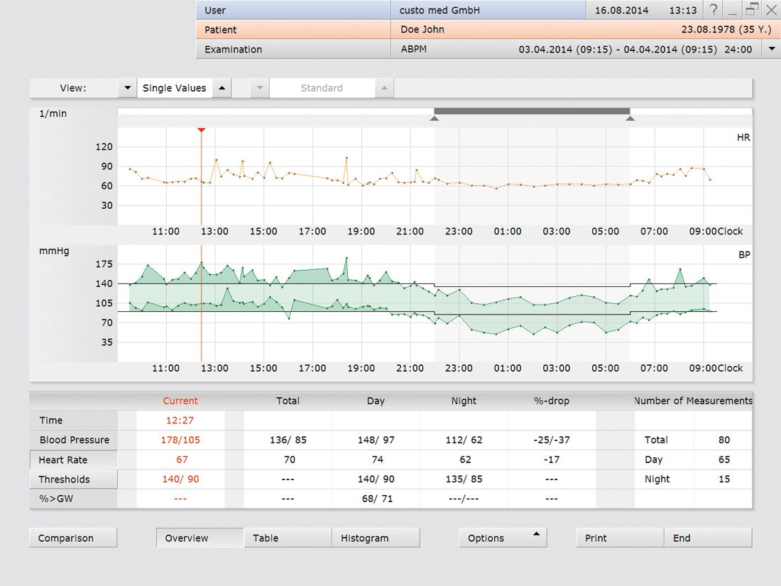 Tablo biçiminde gösterim tüm yapılan ölçümler için tam bir bakış açısı sunar.Buna ek olarak, hastanın günlüğündeki ilave ölçümler için yazdığı yorumlar cetvel üzerine kaydedilir.Gündüze göre gece fazında oransal azalış, ortalama değer , standart sapma ve diğer verilerde gösterilir.