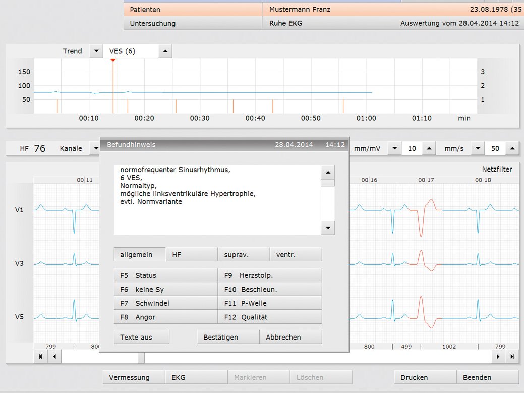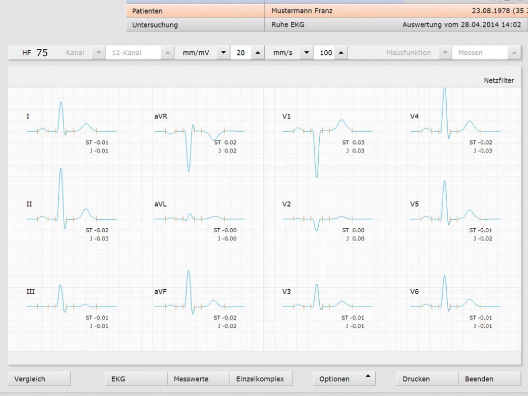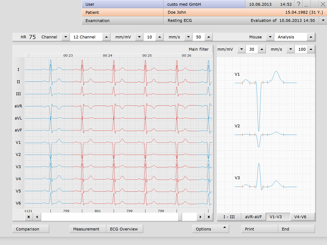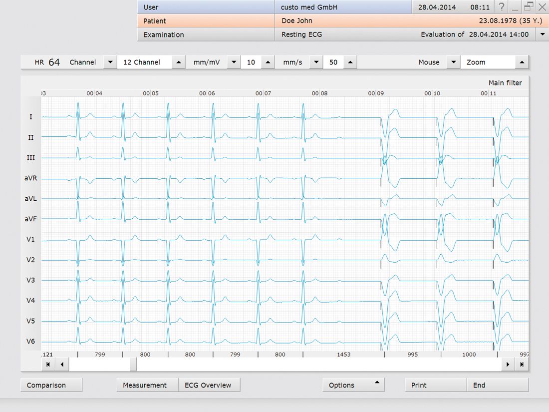 EKG genel görünümünde, tüm kayıt süresi boyunca EKG, 12-kanallı olarak sistemde gösterilir. Her bir lead’in tek kanal seçimi yapılarak görünüm, hız ve genliği değiştirilerek bütün ayrıntıları tam olarak değerlendirilebilir. Zoom ve ölçüm fonksiyonu parametre hesaplanması için faydalıdır.İstenilen EKG kısmı işaretlenir ve daha sonra işaretlenen hemen tekrar bulunabilir. İsteğe bağlı iki istirahat EKG ‘nin karşılaştırma fonksiyonunu kullanarak birbiri ile kıyaslanması mümkündür.