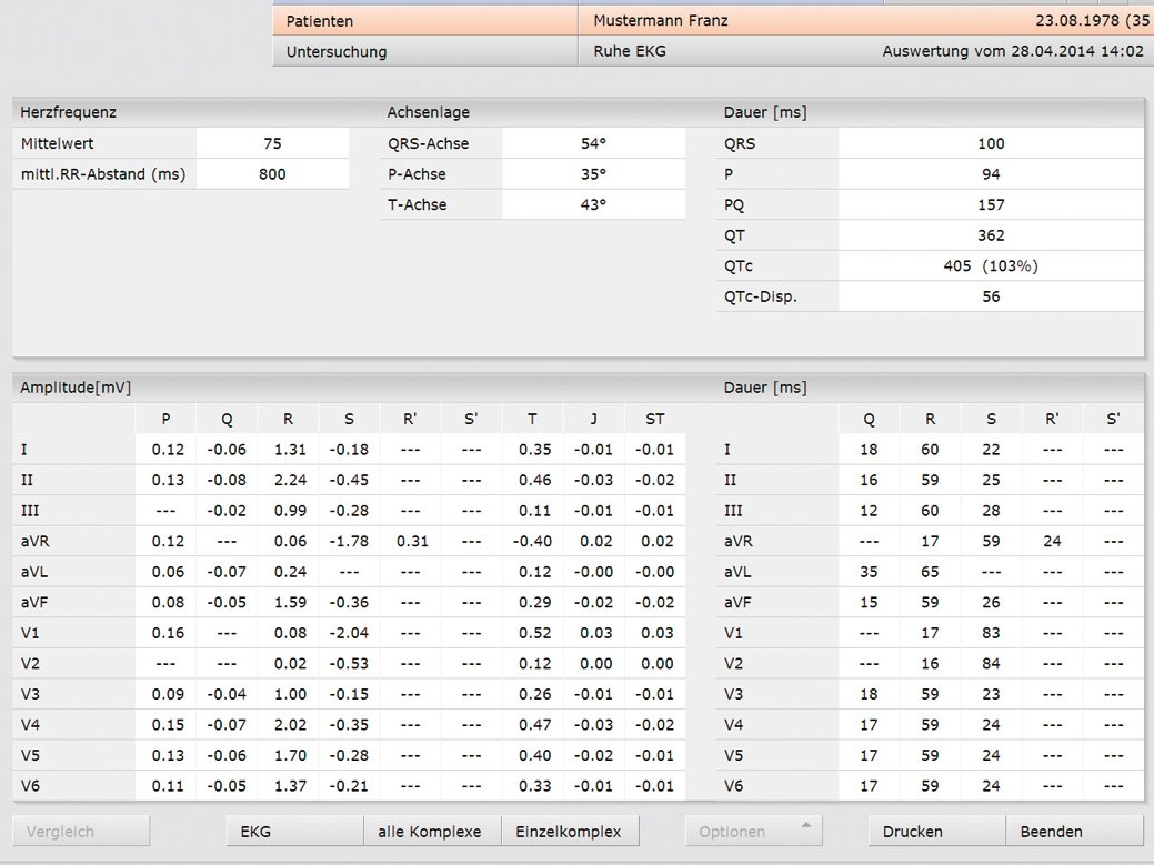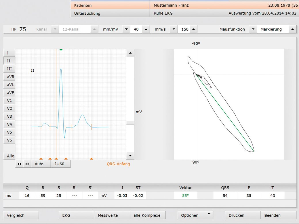 Kanalın kümülatif kompleksinin tekli kompleksinde gösterim büyütülmüştür. Hareketli ölçüm hatları sayesinde kullanıcının elle test noktalarını yeniden tespit etmek mümkündür. Overlay Fonksiyon tüm kanalların kümülatif komplekslerini birbirlerinin üstünde düzenler.Test noktalarının kesin belirlenmesi için ek bilgi kaynağı olarak hizmet vermektedir. Sağ tarafta ECG'nin vektör döngüsü otomatik olarak görüntülenir.